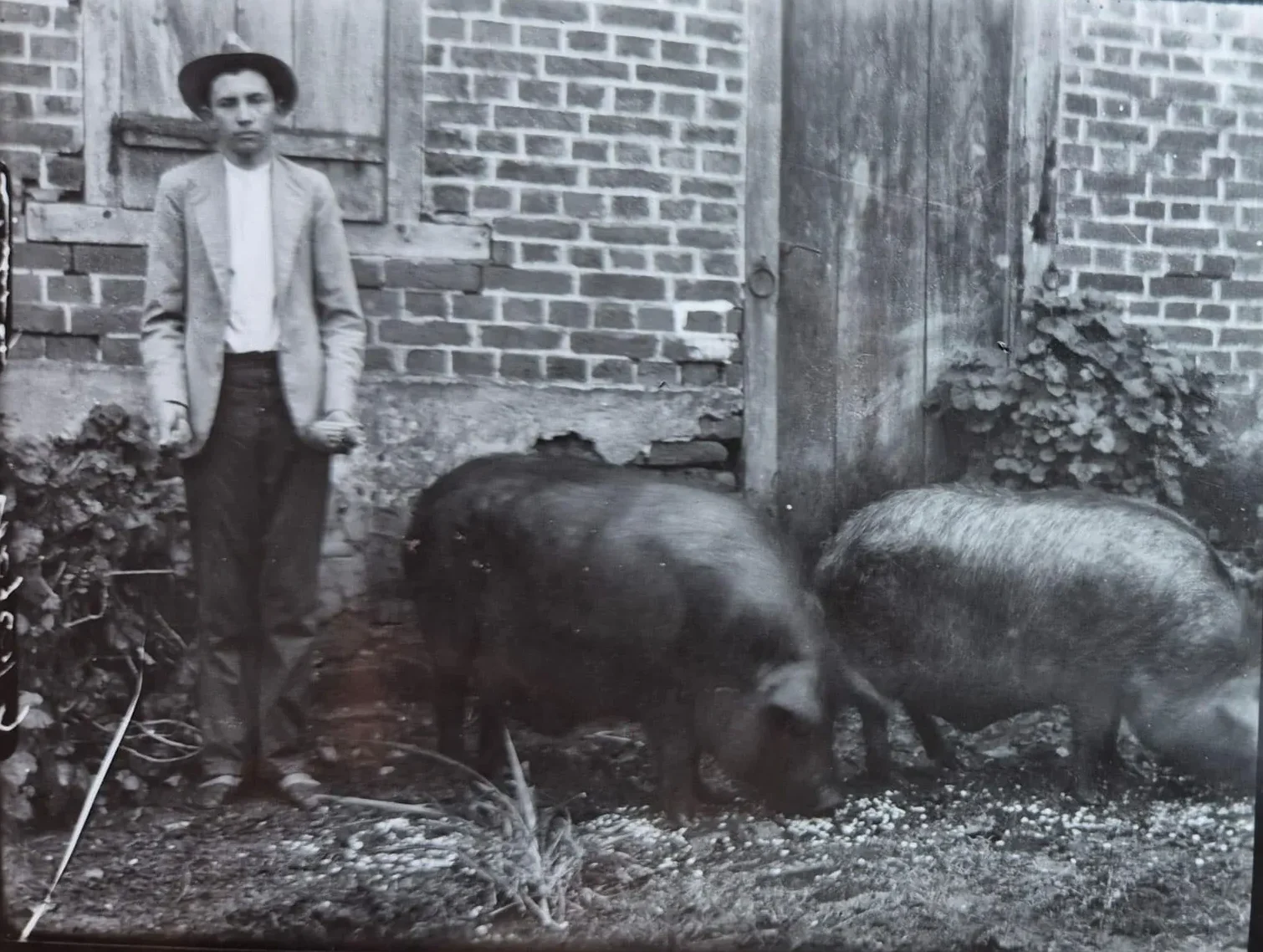 O colono retratado junto ao porco gordo em Dois Irmãos nos anos 50 (Acervo Sandro Blume)