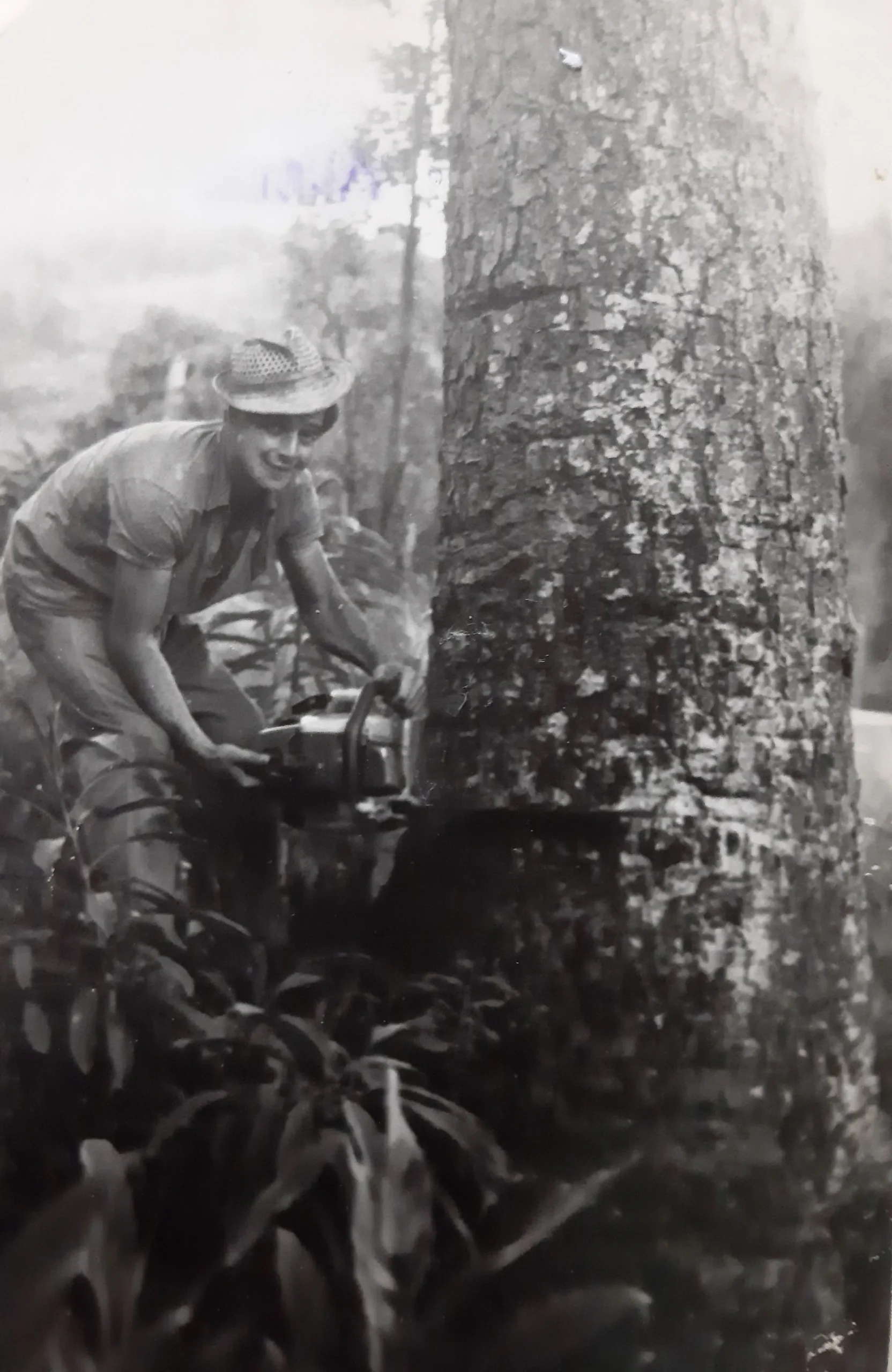 Alípio Blume e Felipe Aloysio Blume removendo toras de madeira do traçado onde passaria a BR 2