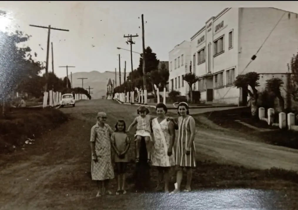 Foto histórica documentada neste Especial, mostra pessoas da família Wirth junto a Antiga Wirth e Kunzler, na descida para o Vila Rosa, que ainda não tinha pavimentação. Te convidamos a acessar o site do Diário e conferir mais uma dezena de fotos antigas e históricas (acervo Juarez Stein)