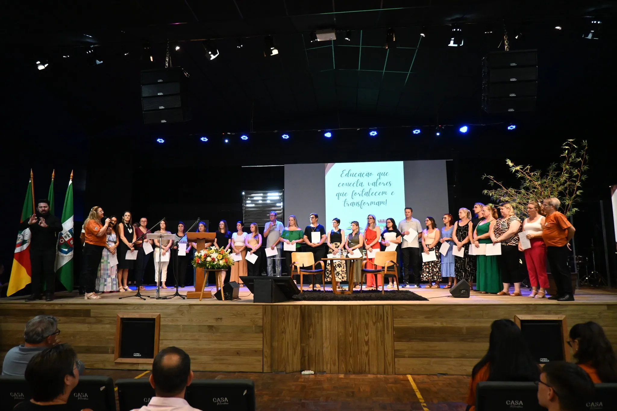 A solenidade aconteceu na Casa Ministério e contou a presença do prefeito em exercício, Juarez Stein, do secretário da Fazenda e Administração, Afonso Bastian, do secretário de Planejamento e Sustentabilidade, João Jordan da Silva, do secretário de Infraestrutura e Serviços Públicos, Marcos Aurélio dos Santos, vereadores, equipe da Secretaria de Educação, educadores, monitores e serventes escolares.