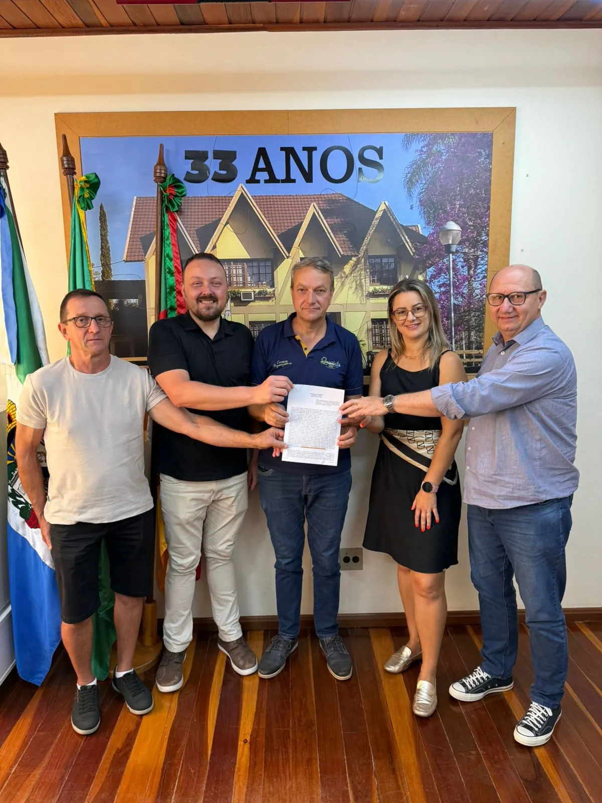 A entrega da emenda contou com a presença do prefeito Luiz Spaniol, do vice-prefeito Joel Metz e do presidente do Sindicato dos Trabalhadores Rurais de Presidente Lucena/Ivoti e Lindolfo Collor, Gabriel Bervian, reforçando a importância da parceria entre o poder público e as entidades representativas do meio rural.