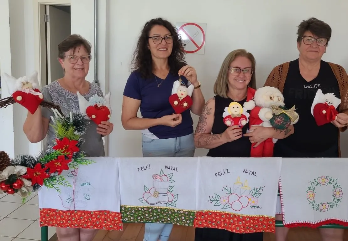 Dois Irmãos – O clima natalino tomou conta do Espaço da Arte durante a entrega dos mimos confeccionados pelas participantes das oficinas de artesanato. A professora Bernadete Maria Lippert Strassburger conduziu o momento especial, que teve a participação do secretário de Desenvolvimento Social e Habitação, Ederson Arantes Bueno, e da coordenadora da Coordenadoria da Mulher, Kelly Berlitz.