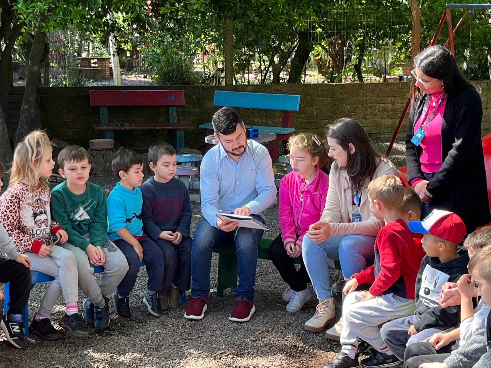 Prefeito Diego Francisco com as crianças da rede municipal de ensino (FOTO: Divulgação / PMEV)