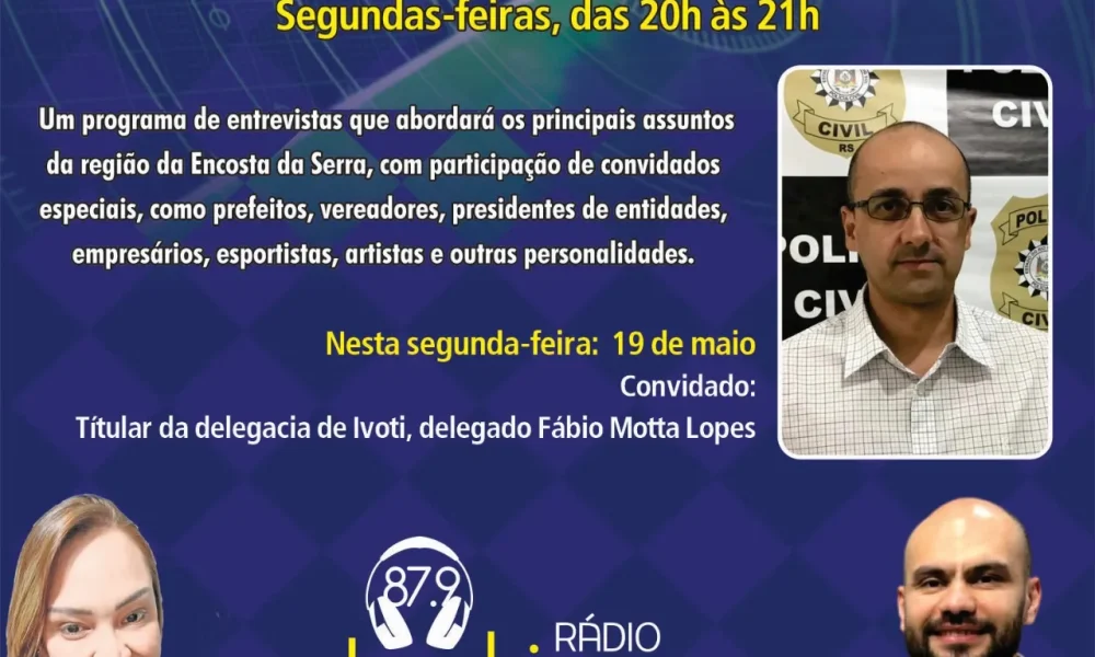O primeiro entrevistado do programa será o delegado Fábio Motta Lopes, titular da Delegacia de Polícia de Ivoti.