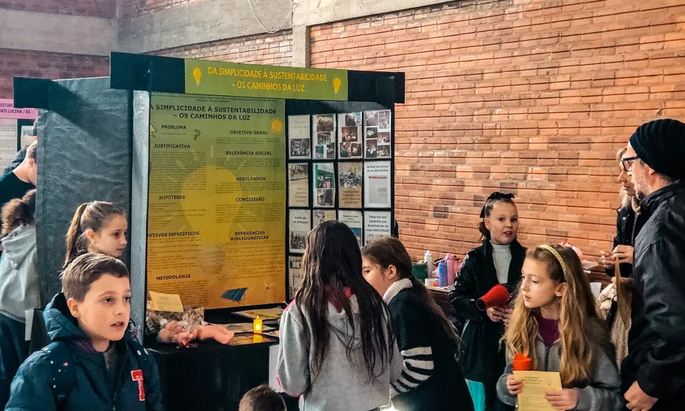 A professora contou que, na infância, seus irmãos viveram um período sem acesso à energia elétrica. A curiosidade dos alunos diante desse relato inspirou o desenvolvimento do projeto, que foi apresentado pelas alunas Sofia Kayser, Lívia Mohl e Natália Steffen.