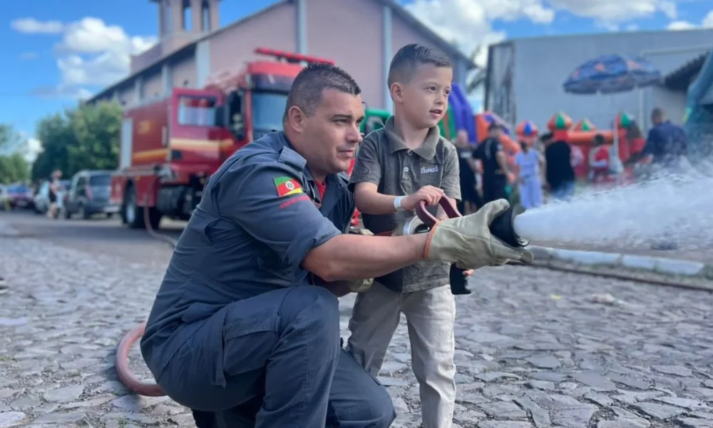 Uma guarnição do Corpo de Bombeiros de Estância Velha esteve presente com uma atividade educativa, mostrando às crianças o funcionamento do trabalho dos bombeiros e permitindo que manuseassem equipamentos, como mangueiras, além de experimentarem roupas da corporação.