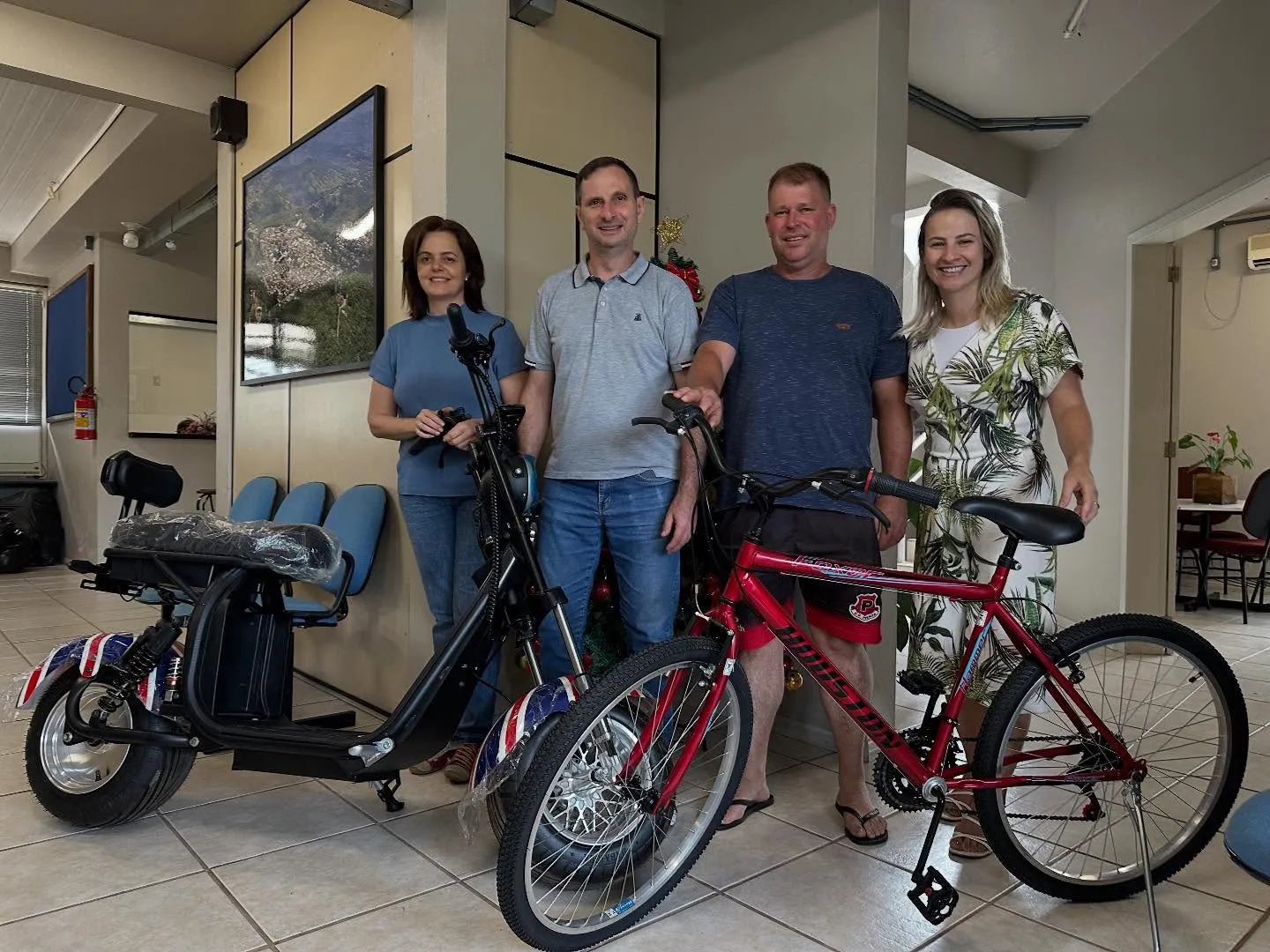 Morro Reuter – Ocorreu nesta segunda-feira a entrega dos prêmios principais da Campanha Sorte na Compra, de Morro Reuter. O sorteio foi realizado no último sábado, na Praça Municipal José Paulo Sabá Meyrer. A ganhadora da scooter elétrica foi Anelise Bredow (compra realizada no Ponto Certo) e o ganhador da bicicleta 18 marchas foi Adilson Schumacher (compra feita do Mercado SI). A entrega foi feita pelo prefeito Airton Bohn na presença da secretária municipal de Desenvolvimento Econômico, Cultural, Turístico e Rural, Thaís Backes Klein.