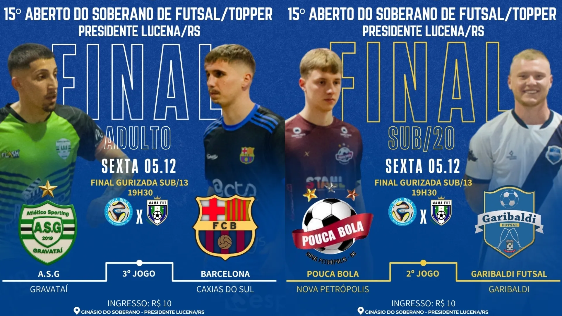 Presidente Lucena – O Ginásio do Soberano promete receber grande público na noite desta sexta-feira (5) para as decisões do 15º Aberto do Soberano, uma das maiores competições de futsal amador do Rio Grande do Sul. As finais das categorias Sub-20 e Adulto encerram um torneio marcado por alto nível técnico, equilíbrio e uma das grandes premiações da região. As disputas iniciam às 19h30, com um amistoso preliminar entre Bola Bola de Nova Petrópolis e Mama Fut de São Sebastião do Caí.