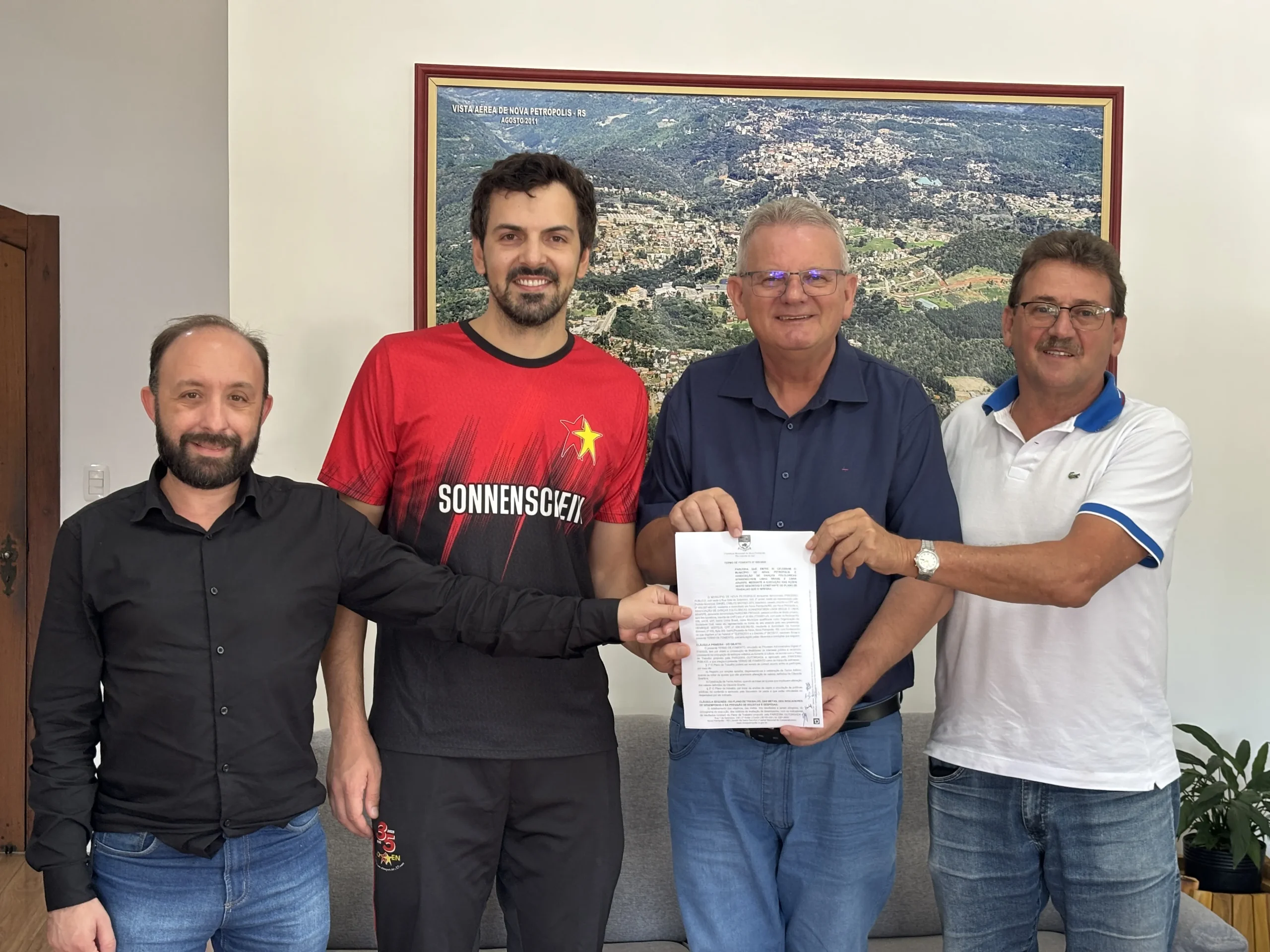 O prefeito Daniel Carlos Michaelsen assinou, na tarde de quarta-feira, 1º de abril, o repasse de R$ 10.000,00 para a Associação de Danças Folclóricas Sonnenschein, das localidades de Linha Brasil e Linha Araripe. O ato, realizado no Gabinete Oficial com a presença do presidente da entidade, Henrique Seefeld, formaliza a entrega do recurso destinado por meio de emenda impositiva do vereador Jorge Luiz Lüdke.
