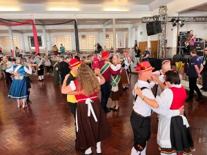 O início da tarde desta sexta-feira (26) foi de festa. No Baile de Kerb da Terceira Idade, realizado na Sociedade Santa Cecília, a corte do Kerb, acompanhada pelo prefeito Jerri Meneghetti, abriu o baile ao som da Banda Real, entraram na dança e puxaram a frente com a clássica polonesa, contagiando todos os presentes.
