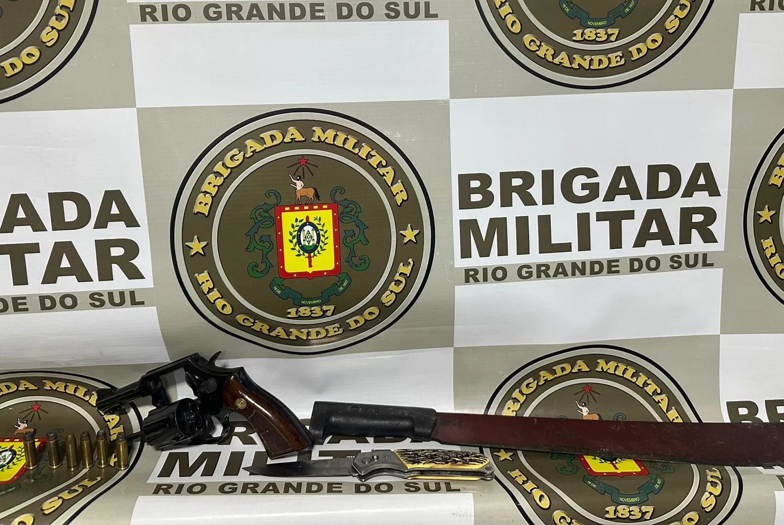 A ação iniciou após informações repassadas via telefone 190 sobre um homem portando arma de fogo e realizando ameaças em frente a um estabelecimento comercial. As equipes da Brigada Militar deslocaram até o endereço, mas os suspeitos já haviam saído do local em um veículo Corolla.