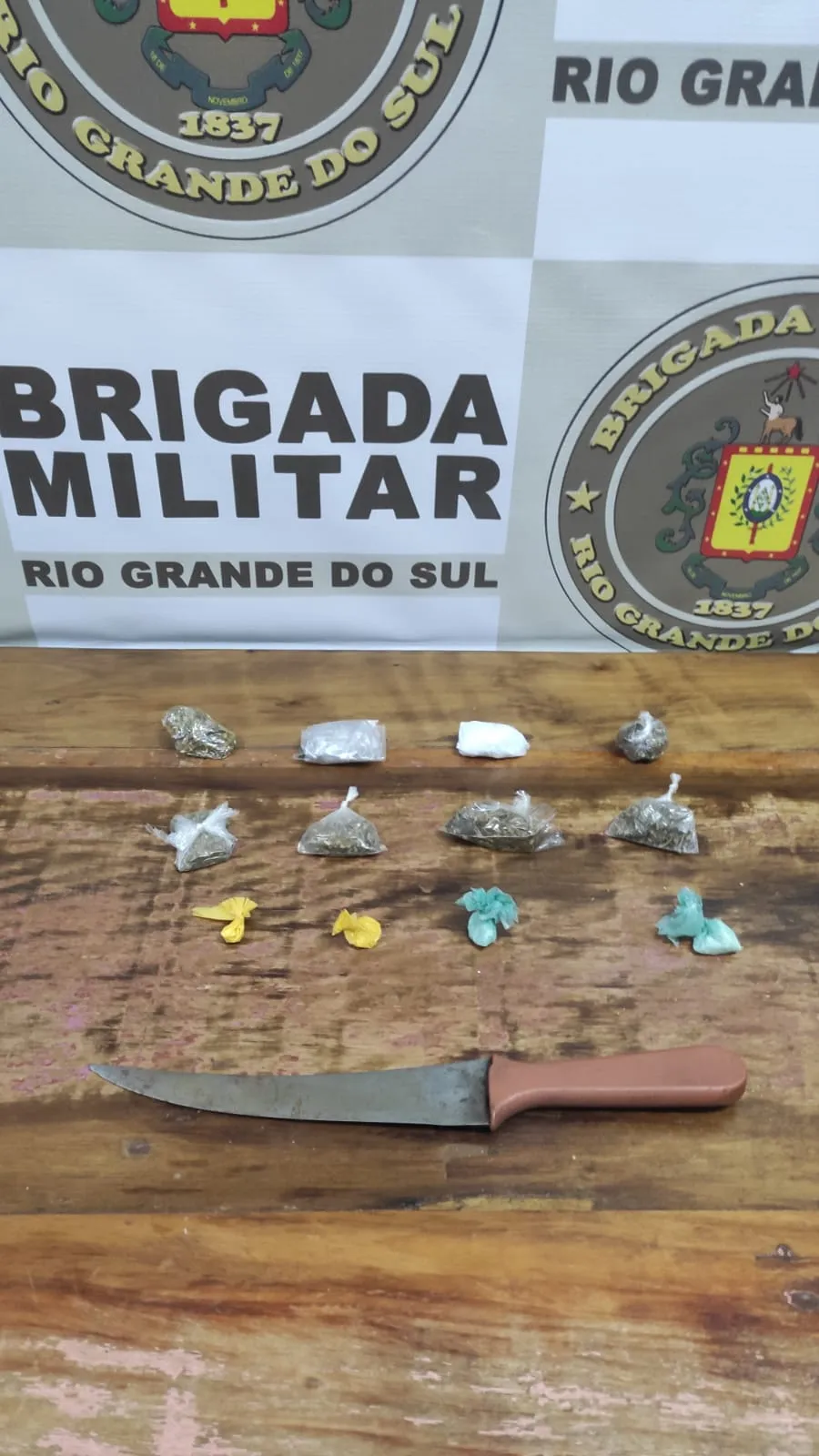 Ao perceber a aproximação da viatura, o suspeito tentou fugir, mas foi rapidamente alcançado pelos policiais após cerca de 500 metros. Na abordagem, os policiais localizaram porções de cocaína e maconha, além de uma faca em sua posse.