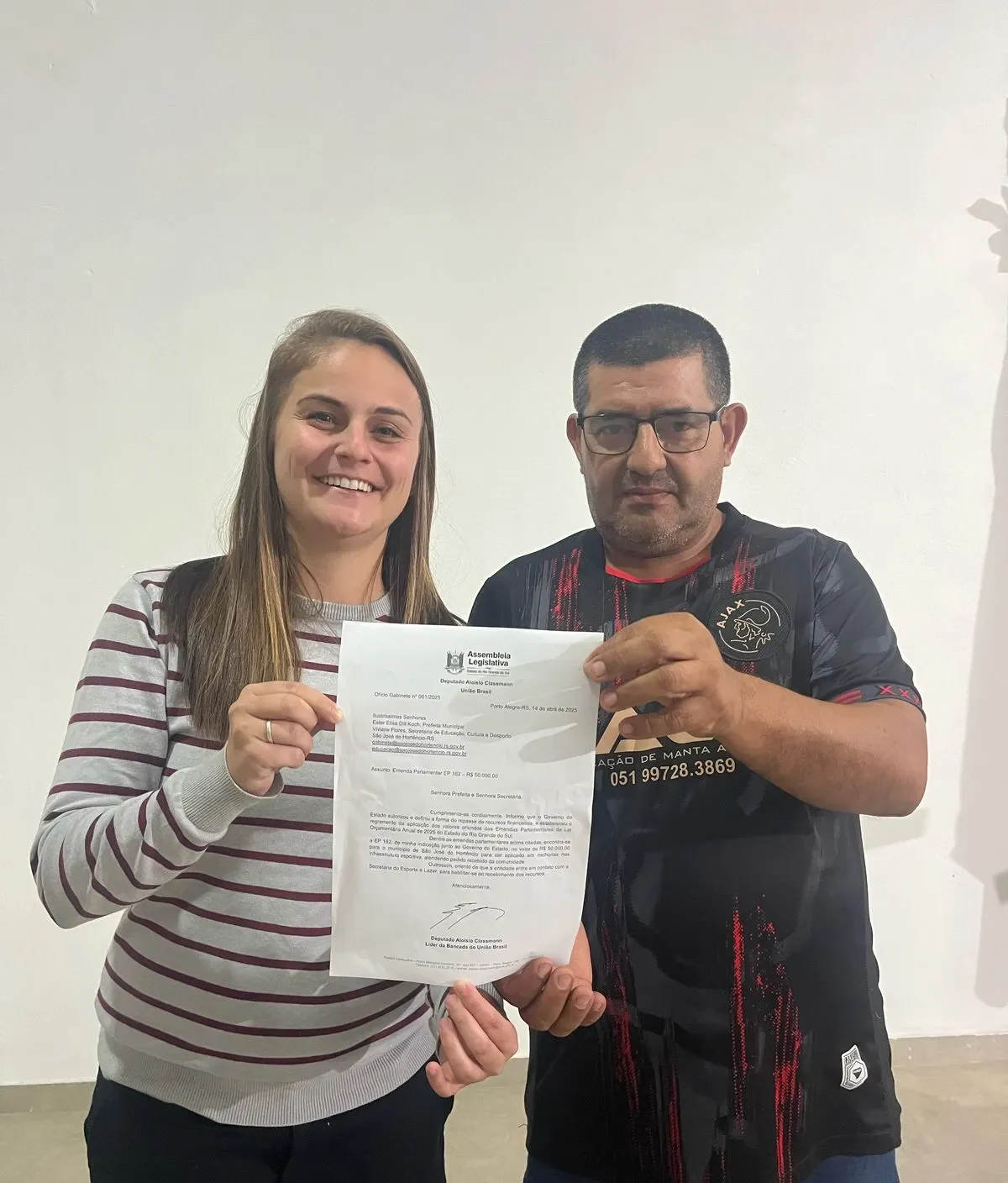São José do Hortêncio – O Município recebeu uma emenda do deputado estadual, Aloísio Classmann, líder bancada União Brasil, que será destinado para o esporte. O empresário, Elemar dos Santos (Jacó) entregou o ofício para a diretora do Desporto, Camila Bauer na quarta-feira, 16, na Câmara de Vereadores. O valor da emenda é de R$ 50.000,00 e será aplicado em melhorias nas infraestruturas esportivas, atendendo pedido recebido da comunidade.