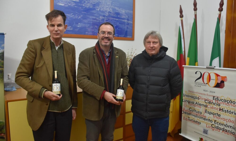 Dois Irmãos – A cervejaria Hunsrück presenteou o cônsul da Alemanha no Sul do Brasil, Marc Bodgahn e o Presidente da Comissão dos Festejos do Bicentenário da Imigração Alemã, Rafael Gessinger, com garrafas da cerveja especial criada para a data.