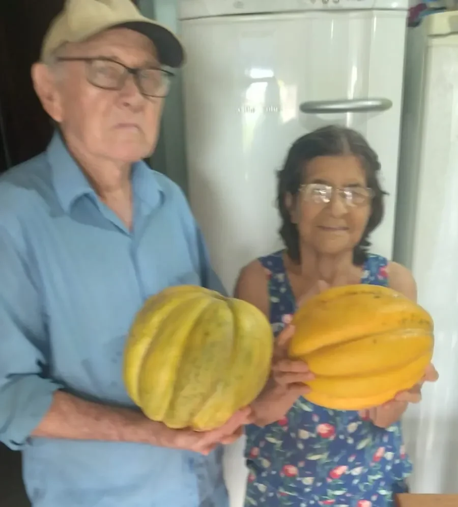Na imagem, seu Edemar Schmitz, 86 anos, com a esposa, dona Acedina de Oliveira, 83 anos e os melões gigantes. Quanto ao segredo para uma fartura dessas na colheita, apenas respondeu que é segredo de família.