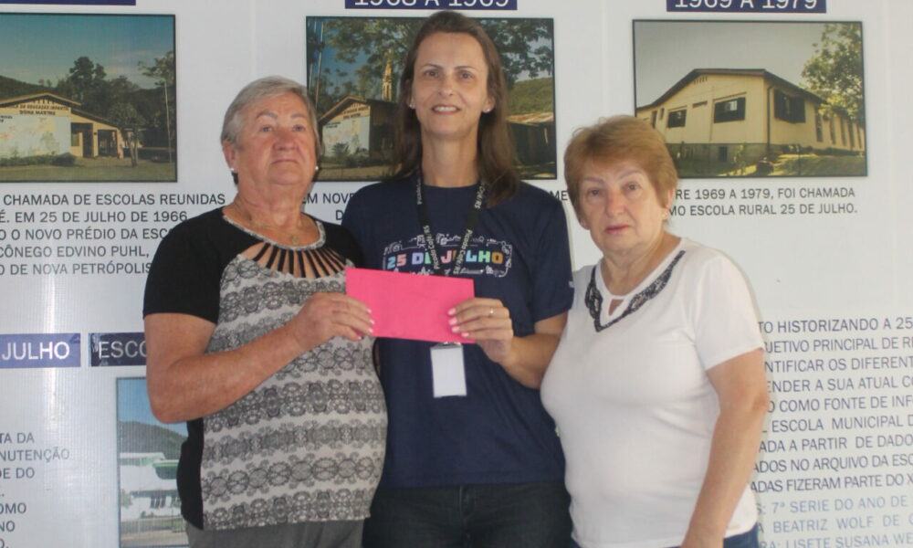 Picada Café – Duas mães, ou até mesmo avós, que sequer filhos ainda possuem nas salas de aula da Escola Municipal 25 de Julho, representando um grupo de mulheres, senhoras que se reúnem uma vez por mês para atividades diversas e manter uma tradição. Representar e com isso, de alguma forma, ajudar a Escola Municipal 25 de Julho. As aposentadas Brunilde Wickert, presidente do Clube de Mães 25 de Julho, e a tesoureira Natália Wolf, afirmaram que fazem isso todos os anos. “A gente não possui mais filhos aqui, mas representa a escola. Esses são recursos que arrecadamos participando de eventos no Parque Jorge Kuhn. A doação é para fazer a alegria dos alunos da escola no Natal”, frisou Brunilde. A amiga Natália se disse emocionada em lembrar todos os anos que o clube faz a ação. “Ver a alegria dessas crianças nos emociona. Nossos filhos estudaram aqui, depois os netos. A gente fica feliz em saber que contribuiu com essa alegria”, detalhou.