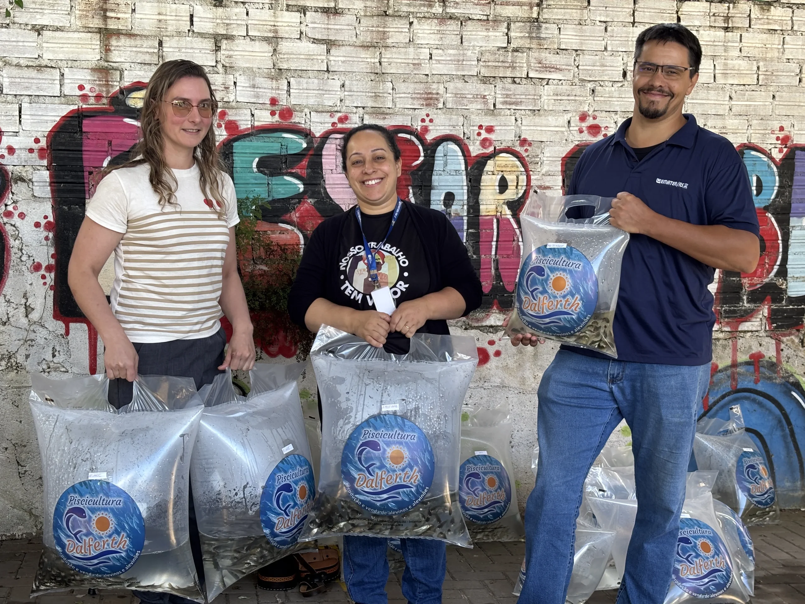 A secretária adjunta de Agricultura e Meio de Ambiente, Silvana Ackermann; o técnico agrícola da EMATER, Pedro João de Deus; e a extensionista da área social da EMATER, Carin Lima, participaram das entregas das espécies de peixe.
