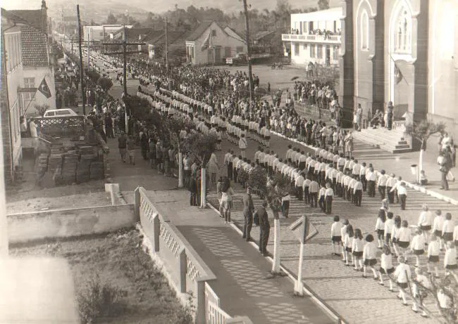 Um dos grandes desfiles cívicos realizados na Av. São Miguel; na imagem, feita do segundo piso do Imaculada Conceição, mostra o Centro da cidade da época