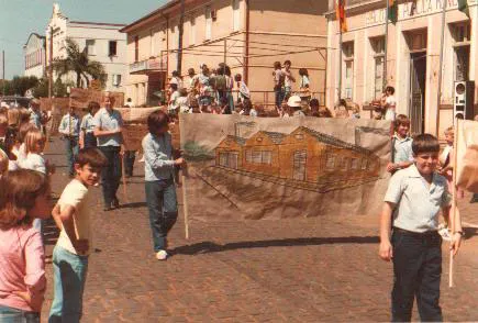 Estudantes desfilando na Av. São Miguel, com colégio Imaculada ao fundo, hospital e a antiga sub-prefeitura (à dir.)