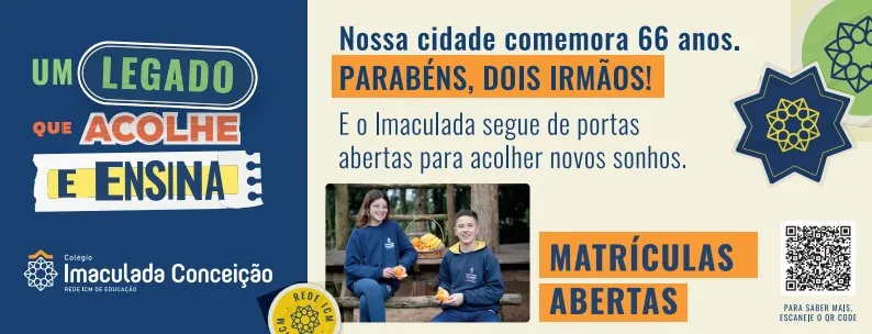 Hoje, ao celebrar os 66 anos de Dois Irmãos, o Colégio Imaculada Conceição parabeniza a cidade por sua história de fé, trabalho e perseverança. Assim como o município, o Colégio segue firme em sua missão de formar gerações, certo de que este legado continuará iluminando caminhos de esperança e conhecimento.
