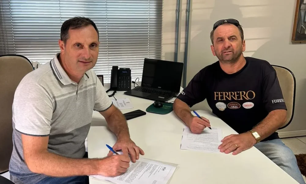 O presidente da Associação Comunitária de São José do Herval, Adriano Knorst, esteve na prefeitura para assinatura do Termo de Opção de Execução de Obra na presença do prefeito Airton Bohn.