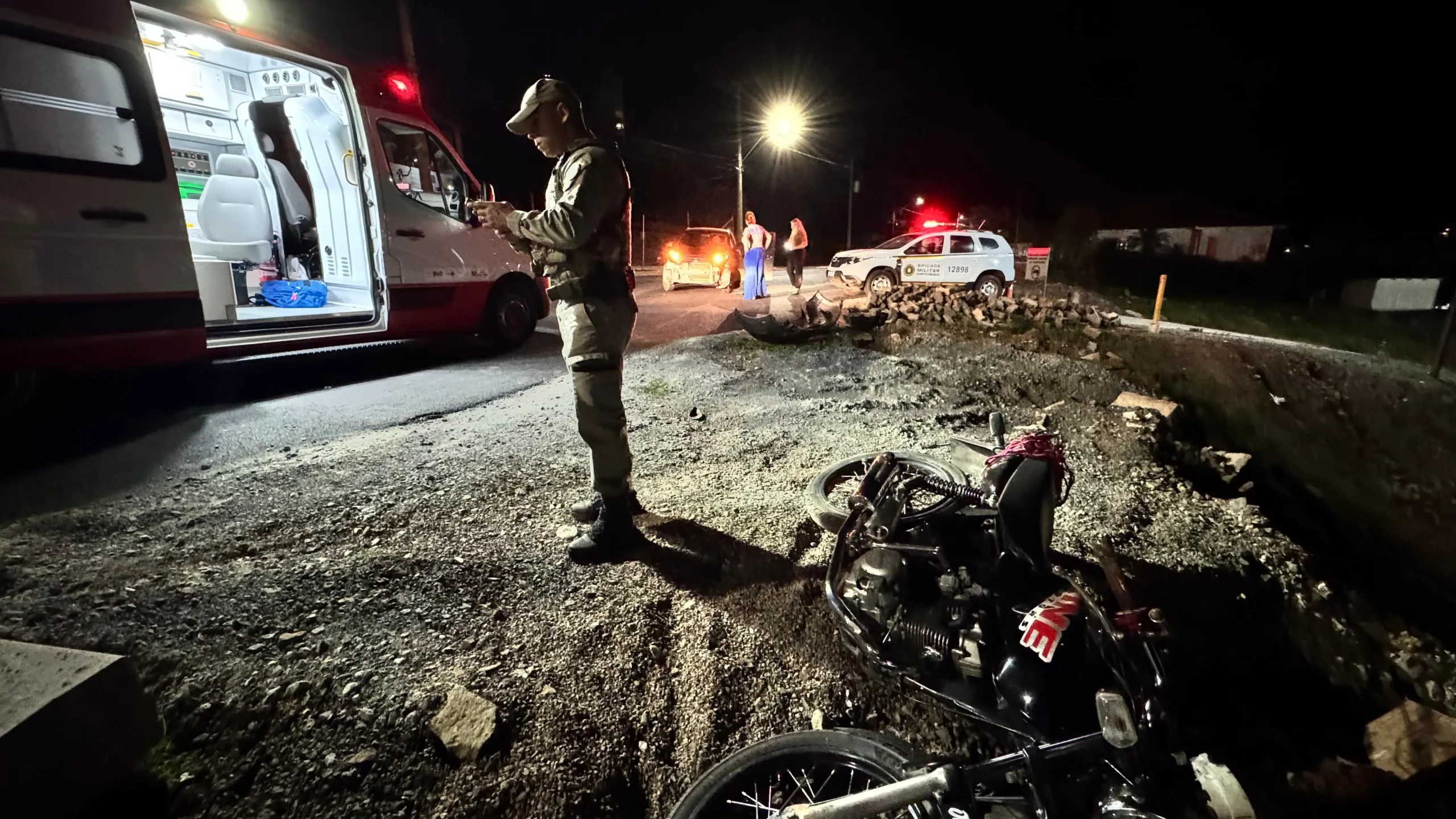 Ivoti – Colisão entre moto e carro deixa motociclista e passageiro feridos, em acidente registrado na noite desta segunda-feira (1º), na rua São Leopoldo, próximo ao acesso de um supermercado.