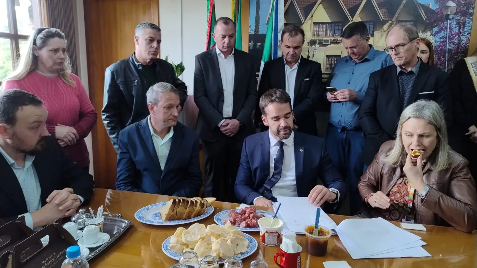 Presidente Lucena – A Prefeitura de Presidente Lucena tem um projeto baseado nas antigas construções enxaimel e tem todo um diferencial das construções atuais. Após a sua chegada no campo do Soberano no início da tarde desta sexta-feira, 6, o Governador Eduardo Leite e demais autoridades foram recepcionados com produtos coloniais no gabinete do Prefeito Luiz Spaniol (Lui), incluindo rosca, nata, pão e schimier. Uma moradora sugeriu que Lui abordasse a questão da Ponte de Ferro, na divisa com São José do Hortêncio, atualmente obstruída para veículos pesados, e que deve ser substituída para comportar carretas com mais de 30 toneladas.