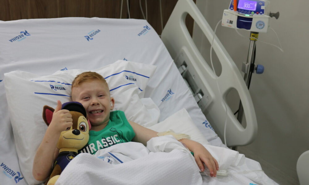 Ivoti/Novo Hamburgo – “Não precisa ter medo, tem que ter coragem!” – essa foi a frase dita pelo Cícero Ellwanger Agnes, de 6 anos, no início do seu tratamento no Centro de Infusão do Hospital Regina, há cinco meses, e repetida inúmeras vezes. Abraçado no seu urso Chase, o pequeno paciente que tem a Síndrome Tricoenterohepática recebe “a vitamina dos super-heróis”, como ele define, uma vez por mês. A condição, que acomete intestinos, fígado e a imunidade, é raríssima e só há 60 casos como este registrados no mundo, dois deles no Brasil.