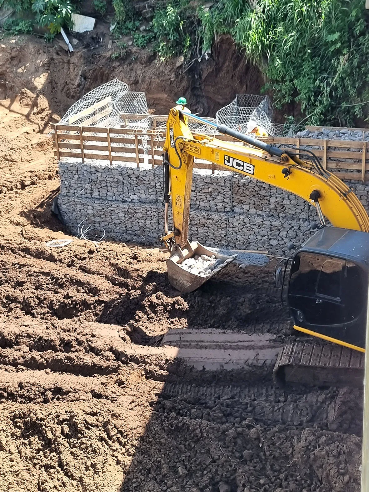 Os gabiões, fabricados em malha de dupla torção de alta resistência conforme a NBR 10514, são preenchidos com rachão e instalados de acordo com técnicas que garantem flexibilidade, permeabilidade e adequada integração ao ambiente. Essa solução permite que a estrutura acompanhe eventuais recalques e facilite o escoamento das águas infiltradas, reduzindo riscos de novos danos.