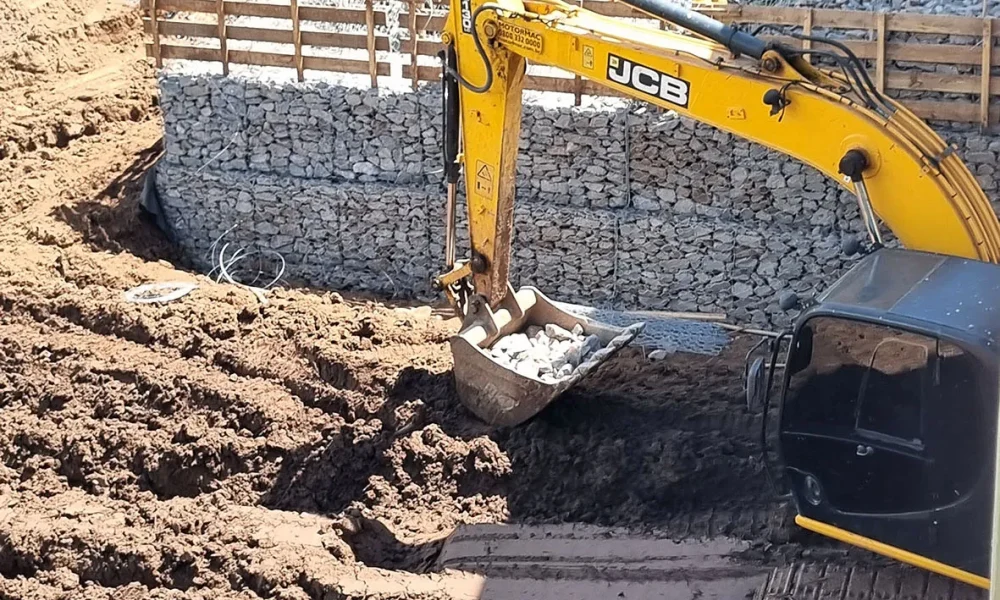 Os gabiões, fabricados em malha de dupla torção de alta resistência conforme a NBR 10514, são preenchidos com rachão e instalados de acordo com técnicas que garantem flexibilidade, permeabilidade e adequada integração ao ambiente. Essa solução permite que a estrutura acompanhe eventuais recalques e facilite o escoamento das águas infiltradas, reduzindo riscos de novos danos.
