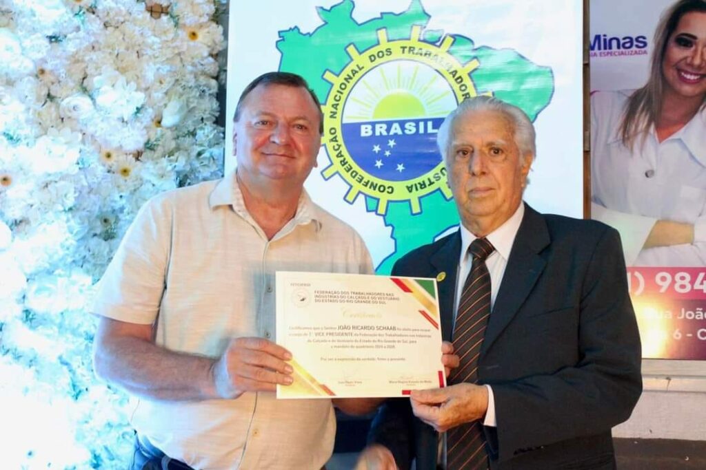 Picada Café/Taquara – Tomou posse na noite de sexta-feira, 15, a nova diretoria da Federação dos Trabalhadores na Indústria do Calçado e Vestuário do RGS (FETICVERGS). O ato ocorreu na na Sociedade 5 de Maio, em Taquara. O presidente do Sindicato dos Calçadistas de Picada Café e Nova Petrópolis, João Ricardo Schaab, o “Tampinha”, e a tesoureira Elvira Graebin, são membros da nova diretoria que possui mandato de cinco anos. Tampinha ocupa o cargo de vice-presidente e Elvira ficou de suplente da diretoria. Para Tampinha, é importante ocupar um cargo tão expressivo em uma entidade forte e destaque. “A Federação, cujo nosso sindicato é filiado, possui papel importante no Estado por representar dois setores importantes e fortes na economia e geração de emprego e renda”, declarou.