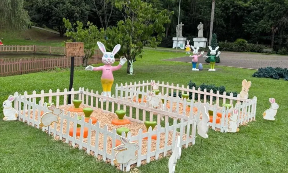A decoração já está sendo instalada no parque e pode ser visitada para fotos, garantindo registros instagramáveis e temáticos da Páscoa.