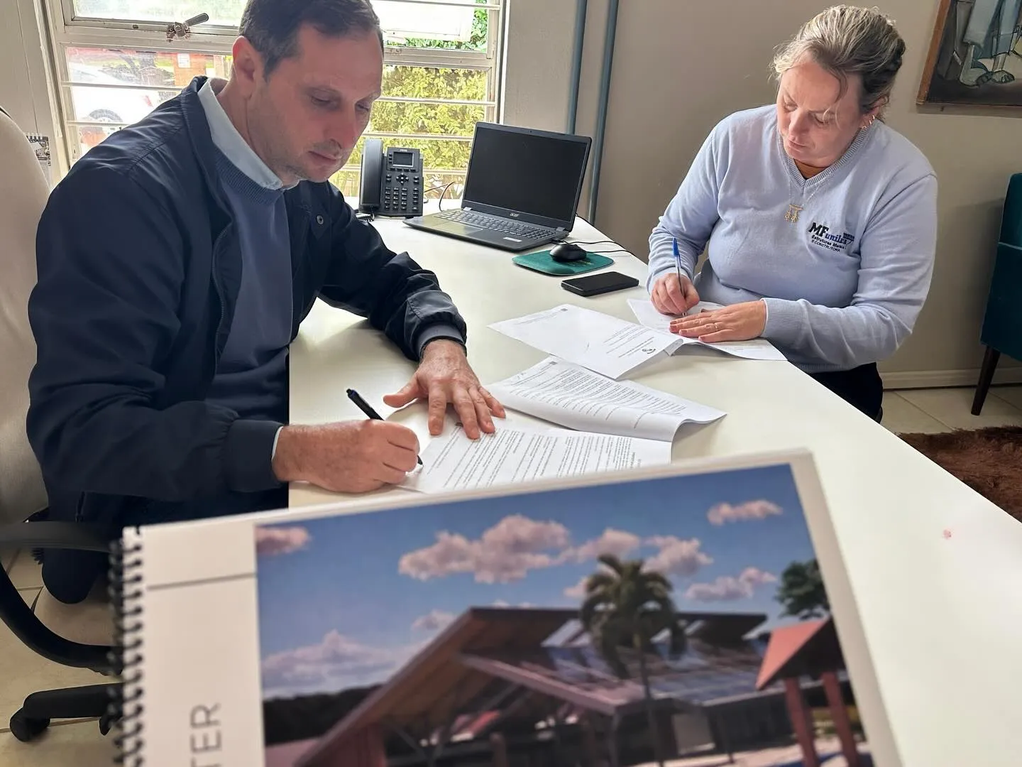 A Praça Municipal José Paulo Sabá Meyrer vai se transformar em um Centro de Eventos com cobertura para que possa ser usufruído a qualquer tempo, inclusive em festividades municipais, reduzindo o custo com aluguel de estruturas. A assinatura do contrato foi realizada pelo prefeito Airton Bohn nesta quinta-feira, dia 30 de outubro. O espaço multifuncional será destinado à realização de eventos e atividades diversas, composto por seis bancas de uso comercial, cobertura em estrutura composta de telhas metálicas galvanizadas e chapas de policarbonato.