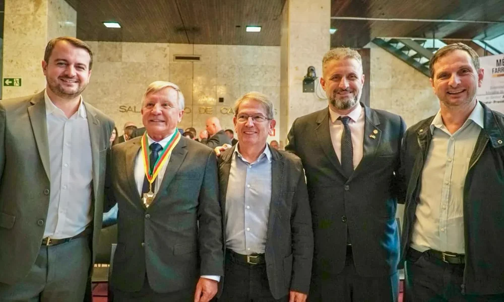 Dois Irmãos /Morro Reuter – Na tarde desta segunda-feira (14), o diretor-presidente do Grupo Herval, José Agnelo Seger, recebeu a Medalha do Mérito Farroupilha. A condecoração foi entregue pelo deputado Marcus Vinícius (PP), representando a Mesa Diretora, e pelo deputado Professor Issur Koch (PP), proponente da homenagem.