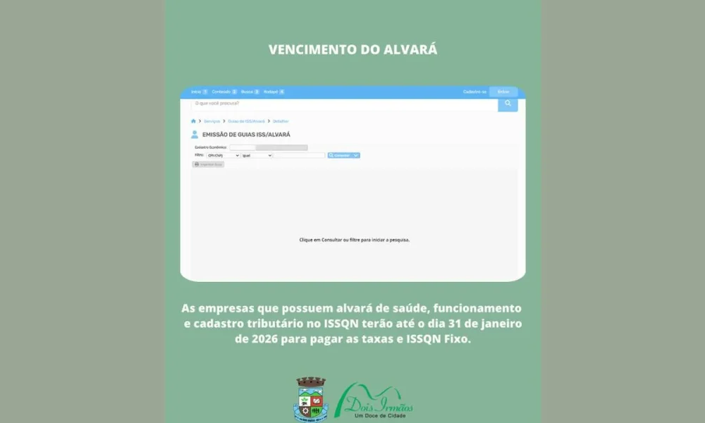 Dois Irmãos -As empresas que possuem alvará de saúde, funcionamento e cadastro tributário no ISSQN terão até o dia 31 de janeiro de 2026 para pagar as taxas e ISSQN Fixo.