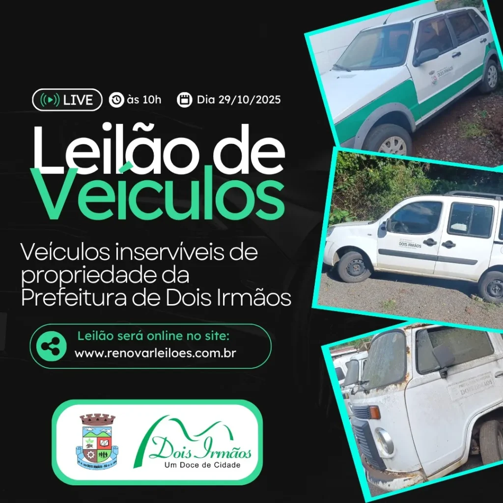DOIS IRMÃOS – A Prefeitura de Dois Irmãos realiza no dia 29 de outubro de 2025, às 10h, o Leilão Público Eletrônico nº 01/2025, de veículos inservíveis de propriedade do Município. O certame ocorrerá exclusivamente de forma online, por meio da plataforma www.renovarleiloes.com.br, e será conduzido pelo leiloeiro oficial Jorge Vinícius de Moura Corrêa.