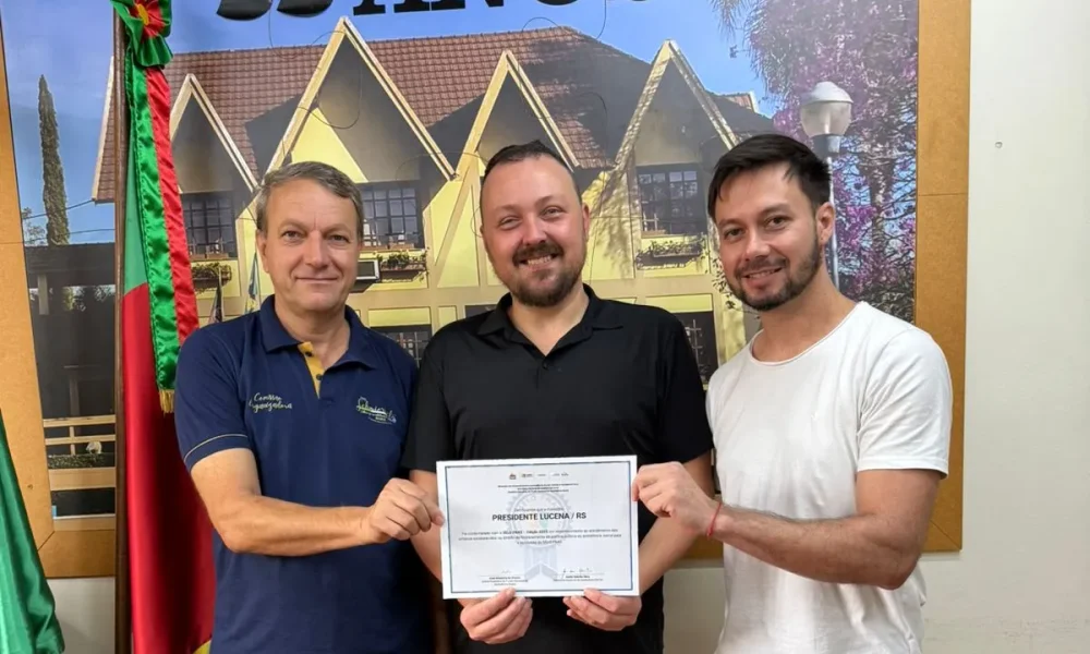 Na foto com o prêmio, estão o prefeito Luiz Spaniol, o vice-prefeito responsável pela pasta, Joel Metz, e o diretor do departamento, Tiago Fröhlich.