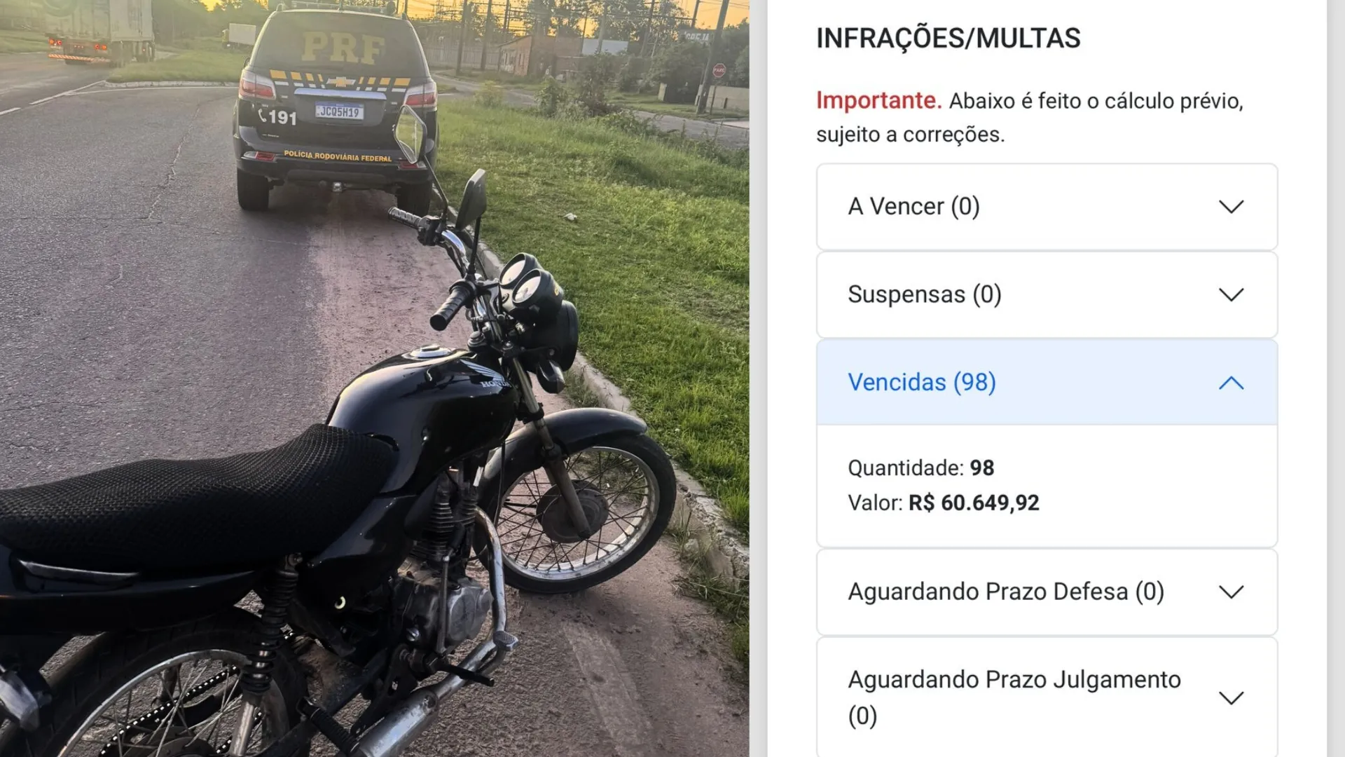 Durante a fiscalização, os policiais deram ordem de parada ao condutor, um homem de 25 anos. Ao verificarem os sistemas, constataram que o veículo possuía 98 infrações registradas, em sua maioria por excesso de velocidade, avanço de sinal vermelho e condução sem capacete em via pública.