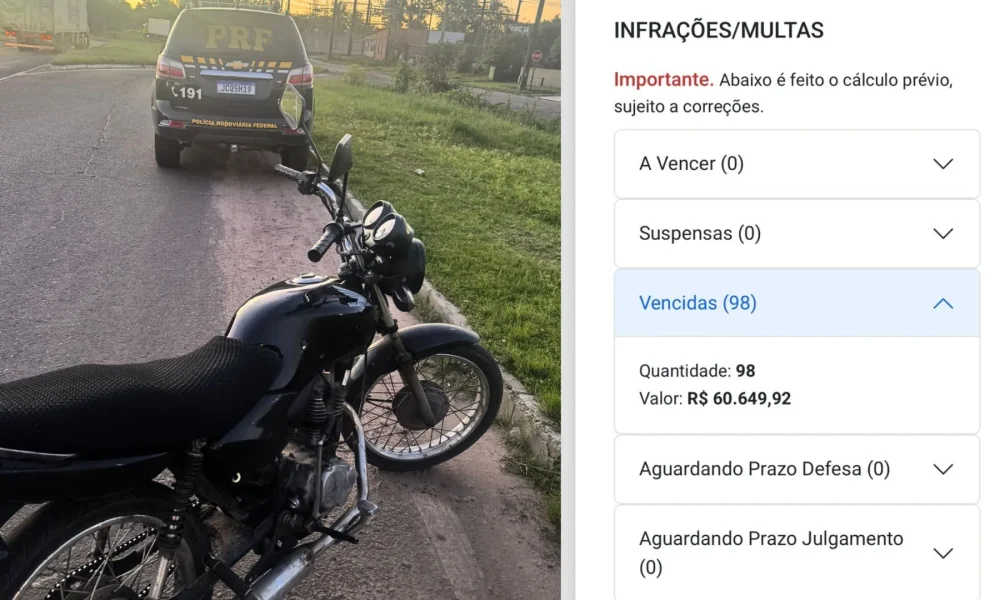 Durante a fiscalização, os policiais deram ordem de parada ao condutor, um homem de 25 anos. Ao verificarem os sistemas, constataram que o veículo possuía 98 infrações registradas, em sua maioria por excesso de velocidade, avanço de sinal vermelho e condução sem capacete em via pública.