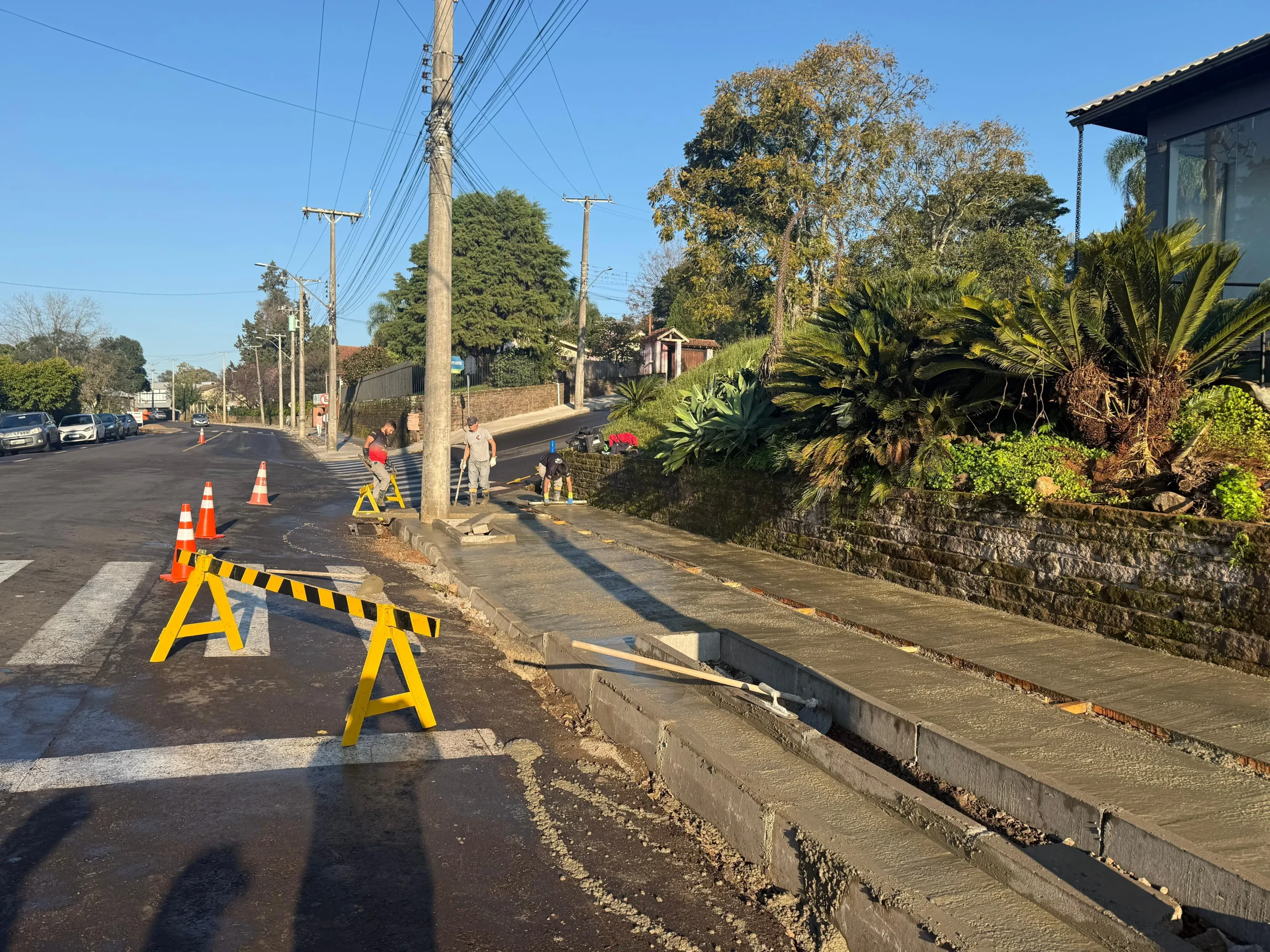 Com o objetivo de melhorar a acessibilidade, a segurança e a mobilidade urbana, a Prefeitura está realizando a requalificação do passeio público na Rua São Leopoldo, no trecho entre a Rua Floriano Peixoto e a Praça Ecológica João Enzweiler.