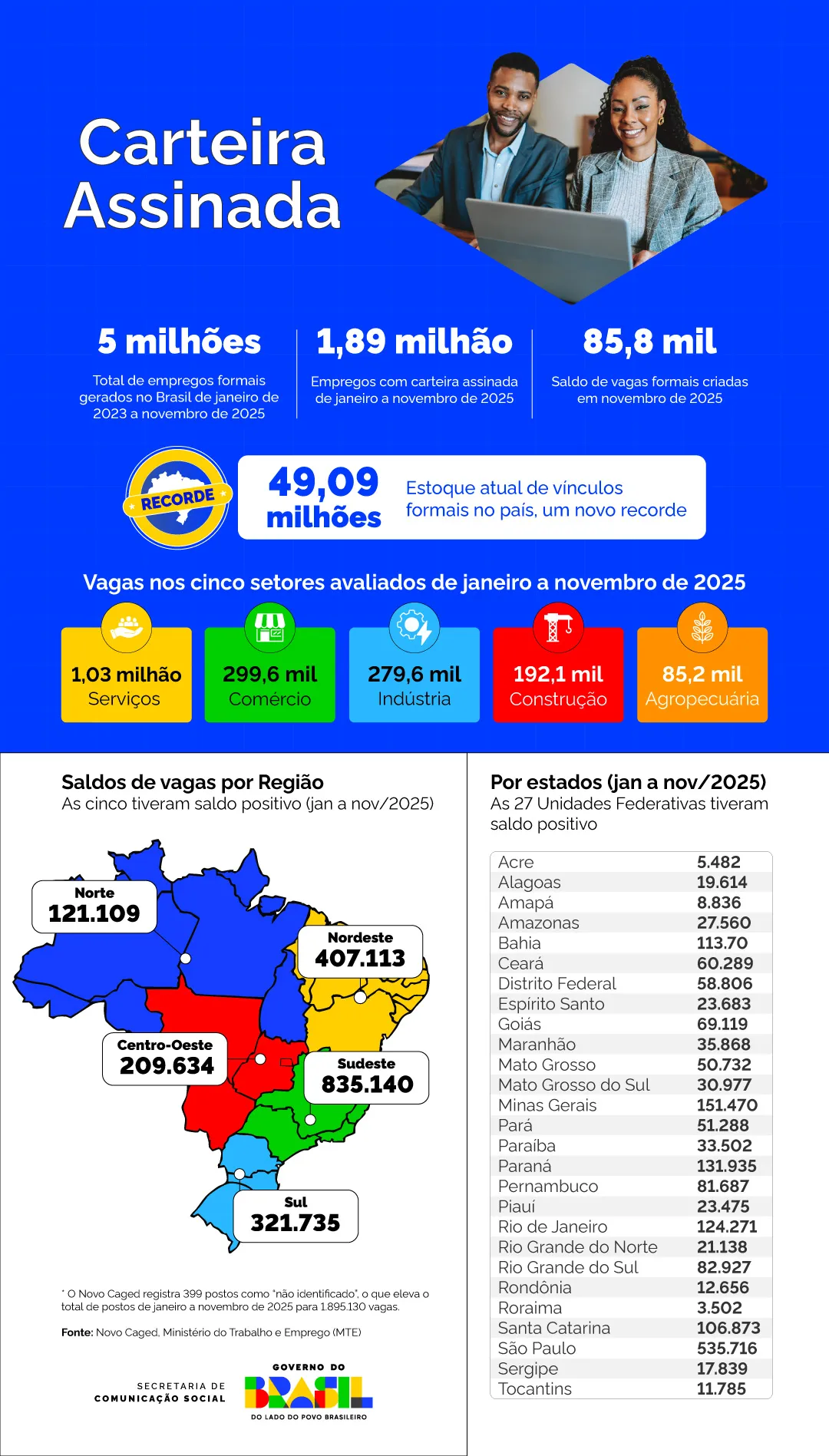 NACIONAL – O Brasil celebrou em dezembro uma cifra superlativa na geração de empregos com carteira assinada entre o início de 2023 e novembro de 2025, superando a marca de 5 milhões de novos vínculos formais criados no país. No período, foram preenchidas 5.028.124 postos. Em novembro do ano passado, o saldo ficou positivo em 85.864 postos de trabalho, resultado de 1.979.902 contratações e 1.894.038 desligamentos. Com isso, o país chegou a 49,09 milhões de vínculos formais ativos, o maior estoque registrado na série histórica do Novo Caged.