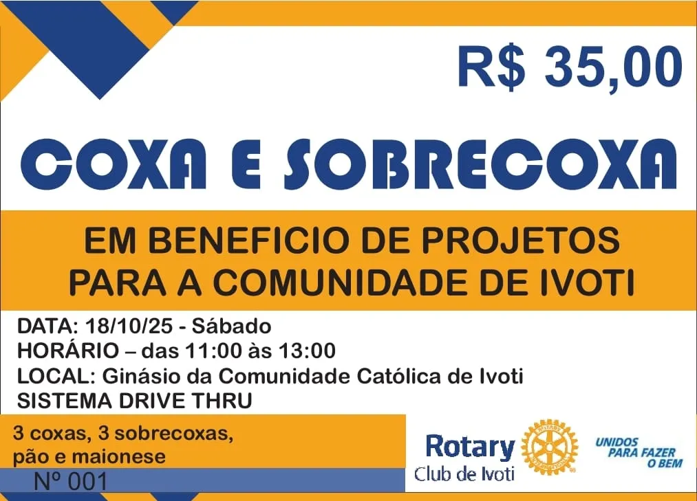 IVOTI – O Rotary Club de Ivoti realiza mais uma ação solidária em benefício da comunidade. Trata-se da venda de coxa e sobrecoxa, um evento gastronômico que alia sabor e solidariedade, com o objetivo de arrecadar fundos para os diversos projetos sociais da entidade.