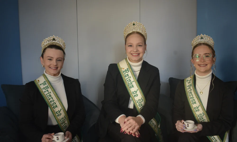 As Soberanas de Dois Irmãos, Caroline Wobeto(Rainha), Clarissa Mielke (1ª Princesa) e Emanuelle Wagner (2ª Princesa), acompanhadas da chefe do Departamento de Turismo, Djenifer Kronbauer, e do assessor de Comunicação, Leonardo Boufleur estiveram no jornal O Diário divulgando o Baumschneis Kolonial Kaffee.