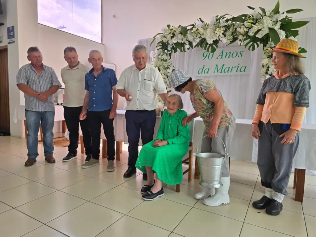 Os 90 anos da Maria Wendling (de verde) tiveram uma linda homenagem da família: Padre Paulo, Ricardo, Pedro, Geraldo, Maria Lúcia e Anna Guilhermina