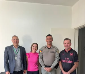 Comandante do 32º Batalhão da PM, Tenente-Coronel Pedro Alexander Beron da Cunha, visitando a Saúde local, com o tenente Nilton Tavares (secretário de Saúde), Anelise Steffen e Roque Mombach