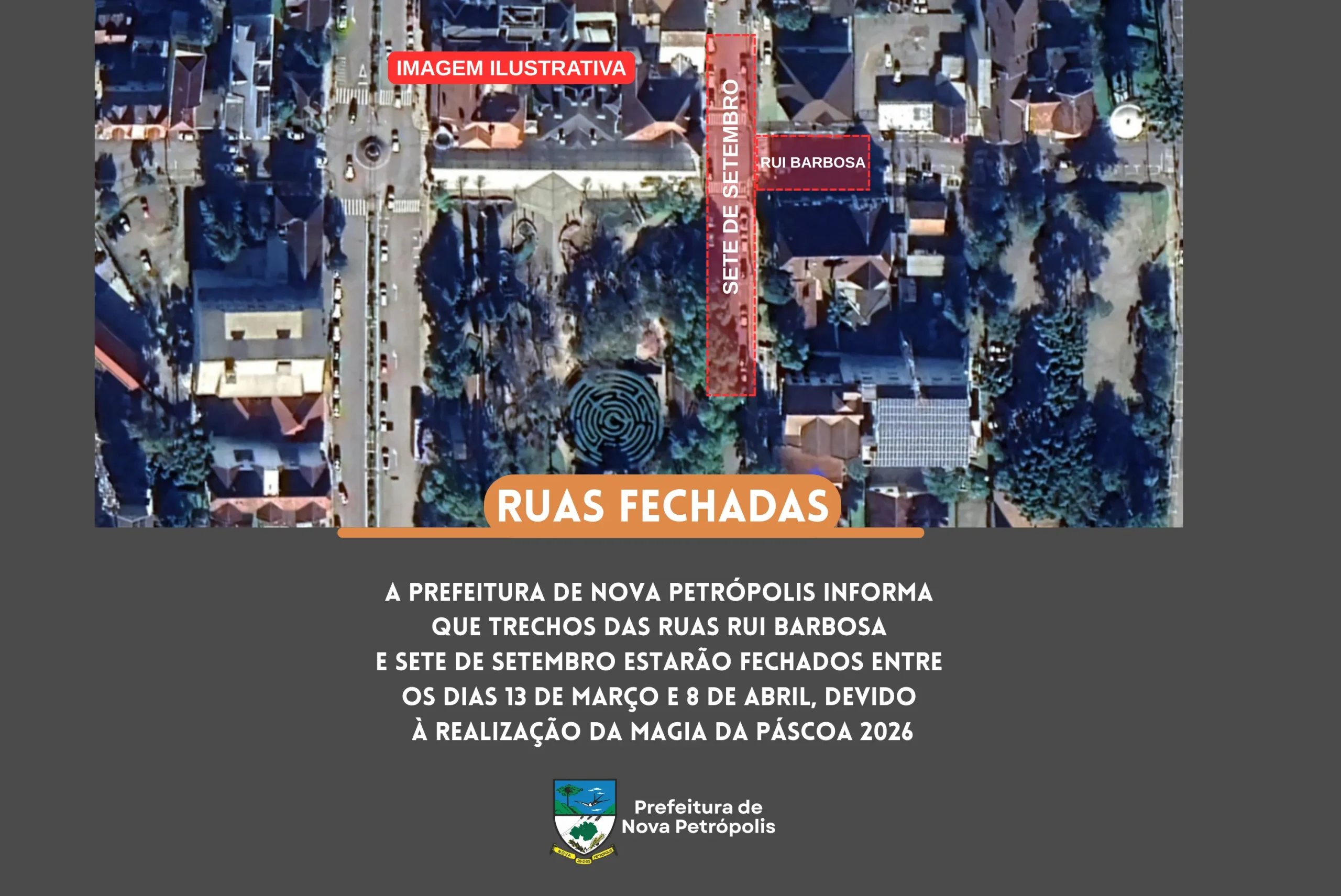 Nova Petrópolis – A Prefeitura de Nova Petrópolis informa que o cruzamento e trechos das ruas Rui Barbosa e 7 de Setembro, no Centro do Município, estarão fechados a partir das 5h desta sexta-feira, 13 de março. O motivo é a montagem da estrutura da Magia da Páscoa 2026. O fim do bloqueio nas vias está previsto para 8 de abril, após desmontagem da estrutura utilizada no evento.