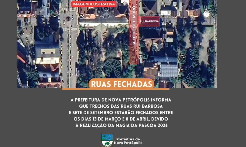 Nova Petrópolis – A Prefeitura de Nova Petrópolis informa que o cruzamento e trechos das ruas Rui Barbosa e 7 de Setembro, no Centro do Município, estarão fechados a partir das 5h desta sexta-feira, 13 de março. O motivo é a montagem da estrutura da Magia da Páscoa 2026. O fim do bloqueio nas vias está previsto para 8 de abril, após desmontagem da estrutura utilizada no evento.