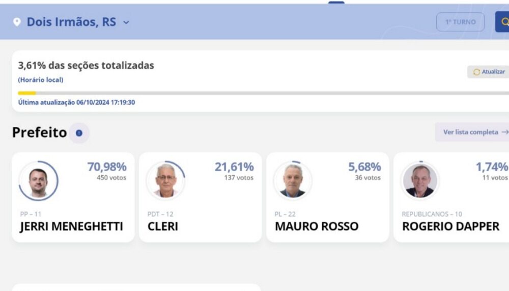 Dois Irmãos – Na primeira parcial divulgada pelo TSE (no site), o prefeito Jerri Meneghetti que busca a reeleição aparece com 70,98% dos votos. São apenas 3,61% das urnas apuradas.