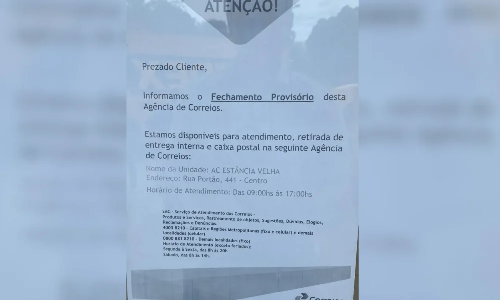 Ivoti – A Agência dos Correios de Ivoti está temporariamente fechada. De acordo com aviso fixado na unidade, o fechamento é provisório, e durante esse período os serviços de atendimento, retirada de entregas e acesso a caixas postais devem ser realizados na Agência dos Correios de Estância Velha, localizada na Rua Portão, 441, no Centro.