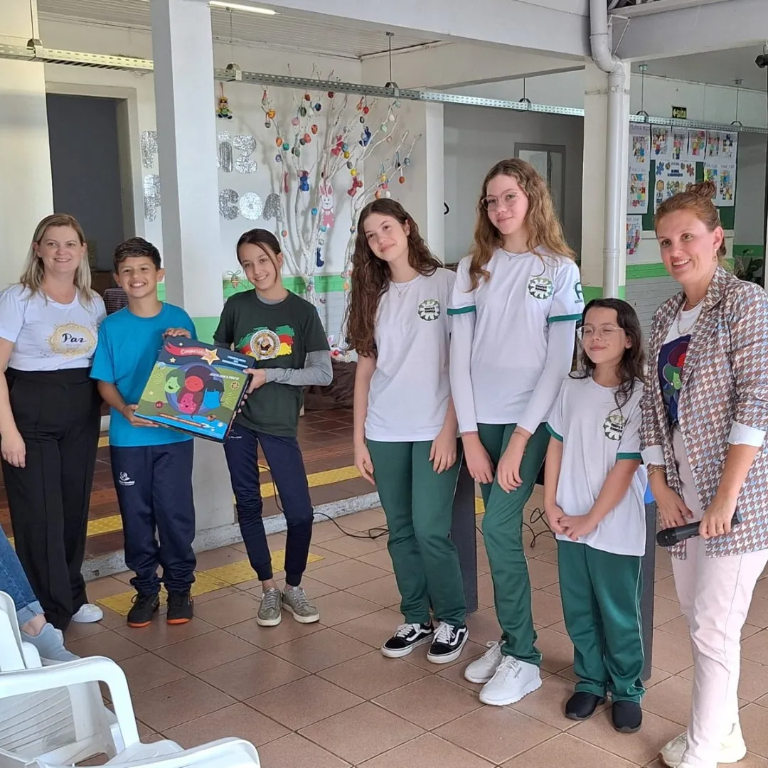 Os estudantes associados da COOPERHANSEN conversaram com os estudantes sobre o processo e sobre os benefícios de integrar uma cooperativa escolar e realizaram a entrega do jogo Cooperlândia aos estudantes Felippe, simbolizando o compartilhamento da experiência.